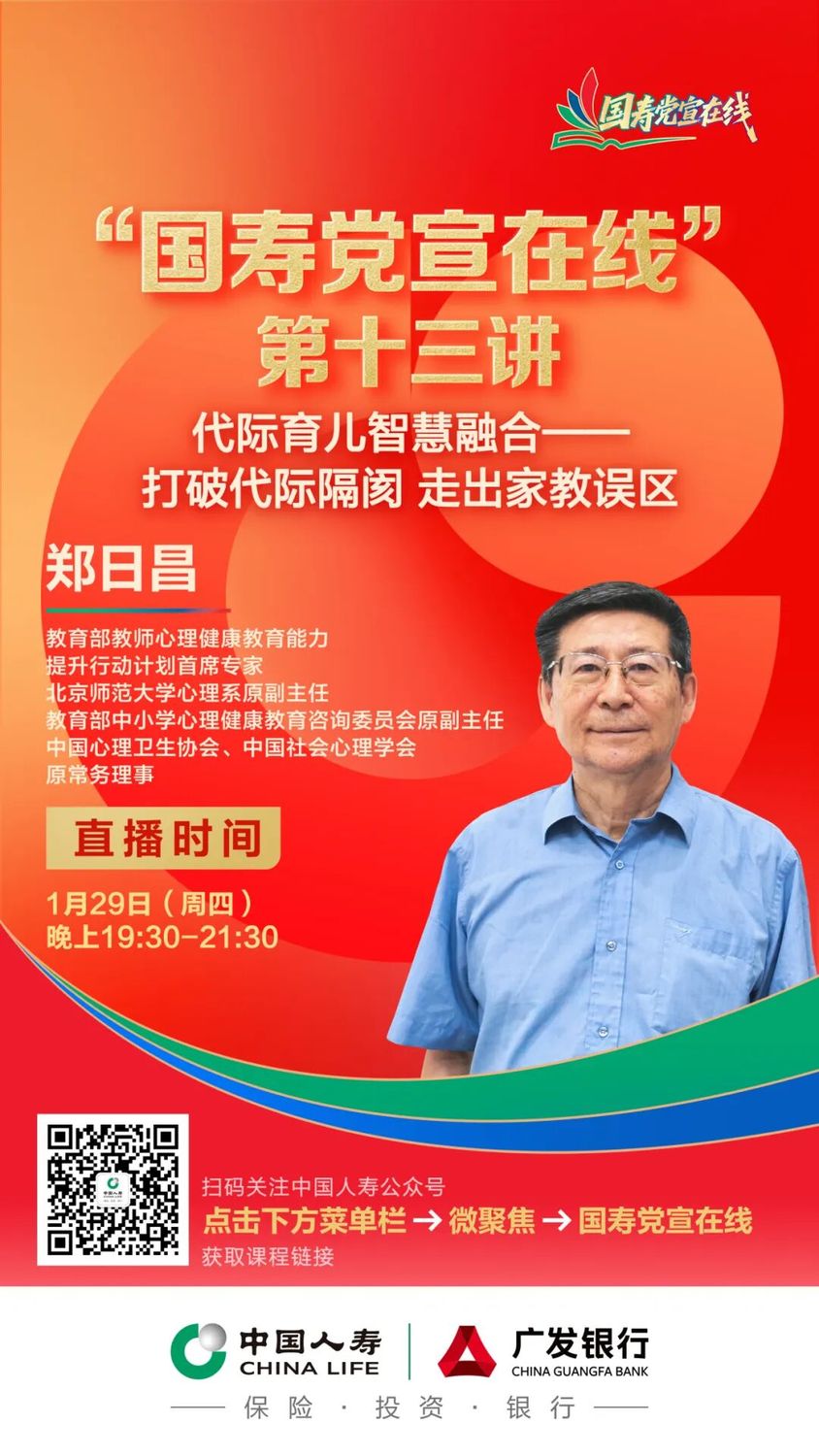 2025年10月起,中国人寿集团面向系统各级党组织和党员推出“国寿党宣在线”系列线上直播课程。课程内容紧跟时政热点,涵盖党建、经济、管理、科技、文化素养等领域,由各知名院校和专家智库联合呈现。 1月29日,“国寿党宣在线”将推出第十三讲线上直播课程,由教育部教师心理健康教育能力提升行动计划首席专家,北京师范大学心理系原副主任,教育部中小学心理健康教育咨询委员会原副主任,中国心理卫生协会、中国社会心理学会原常务理事郑日昌讲授代际育儿智慧融合——打破代际隔阂,走出家教误区,欢迎广大干部员工观看、学习。 ![]() 【直播时间】 1月29日 19:30 【参与方式】 识别海报二维码 关注中国人寿公众号 点击下方菜单栏 ⇓ 微聚焦 ⇓ 国寿党宣在线 获取课程链接 课程专栏面向中国人寿系统内部使用,首次登录需要输入密码,后续无需再输入密码即可直接进入专栏学习。 在专栏内点击“目录”即可看到所有课程链接,最新课程将在最上方显示。 上一篇: 一图读懂中国人寿2026年工作会
