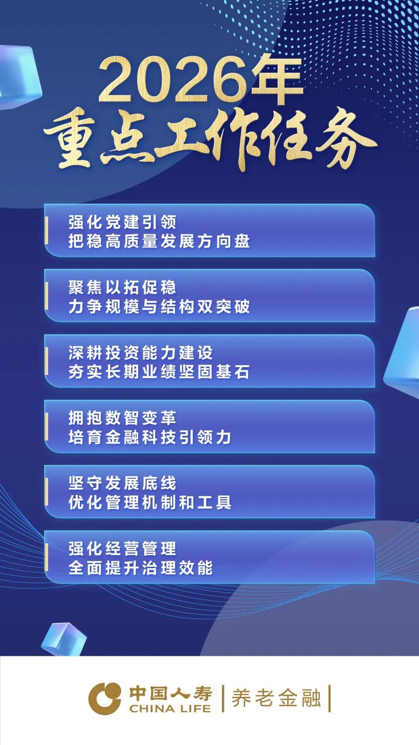 ![]() 工作会议快讯三 1月30日,中国人寿集团旗下养老险公司召开2026年工作会议、全面从严治党暨纪检工作会议。会议全面贯彻落实党的二十大和二十届历次全会精神、二十届中央纪委五次全会精神,认真落实中央经济工作会议以及全国金融系统工作会议部署,传达学习中国人寿2026年工作会议、2026年全面从严治党暨纪检监察工作会议精神,回顾“十四五”发展成绩,分析现阶段形势和问题,研究安排2026年重点任务。中国人寿集团首席投资官,养老险公司董事长王军辉参加会议并讲话,公司党委副书记、总裁余贤群主持会议并总结,公司纪委书记、党委委员孔金华参加会议并讲话。 ![]() “十四五”时期,中国人寿养老险公司深入贯彻落实党中央决策部署,认真落实集团战略目标和工作要求,实现了圆满收官:2025年底,公司管理资产规模近2.4万亿元,较“十四五”期初增长139%,一二三支柱市场份额均实现有效提升,业务结构进一步优化,累计创收达到“十三五”的2倍,行业头雁地位进一步巩固。 ![]() 2025年,中国人寿养老险公司系统各单位锐意进取、砥砺前行,各项工作取得新成效: 纵深推进党的建设,将学习贯彻习近平总书记重要讲话和重要指示批示精神作为首要政治任务来抓,打牢组织基础,强化监督执纪,落实党中央决策部署更加坚决有力。 坚持发展第一要务,基本养老金累计规模超过780亿元,年金业务累计规模超过2.2万亿元,集合计划累计规模与企业数实现行业“双第一”,商业养老金业务存量规模和有效账户数稳居市场首位。 长期业绩保持稳定,企业年金和职业年金受托业绩排名位居行业前列,投资管理收益率实现“中位赶超”,商养投资模式日渐成熟。 系统谋划改革创新,统筹推动转型升级与深化改革,完成“十五五”规划草案编制。 经营发展基础更牢,组织建设、风控合规、金融科技、客户服务、运营管理和数据治理等基础管理能力持续提升,公司当年收入和利润保持两位数增长,均创历史新高。 会议指出 面向“十五五”跨越式发展新征程,中国人寿养老险公司要以核心竞争力全面跃升为主线,锚定行业领导者目标阔步前行。要不断强化党建引领,稳步升级商业模式,有效激活投资与科技“双核”,奋力开创养老金融跨越式发展新局面。 ![]() 会议强调 2026年公司要按照中国人寿集团“333战略”指引,将党中央决策部署转化为推动养老金融高质量发展的具体行动和扎实成效。要坚持和加强党的全面领导,力争实现业务规模与结构双突破,深耕投资能力建设,拥抱数智变革, 守牢发展底线,强化经营管理,为“十五五”时期高质量发展开好局、起好步。 ![]() 会议要求 各单位要围绕2026年度工作总体要求,牢牢把握好“党建为引领、专业为内核、人才为支撑、战略为导向”四大着力点,狠抓贯彻落实、强化执行效能,在公司跨越发展的新征程上再立新功。 ![]() 2026年全面从严治党暨纪检工作会议深入学习领会习近平总书记在二十届中央纪委五次全会上的重要讲话精神,落实中国人寿全面从严治党暨纪检监察工作会议要求,系统总结公司2025年全面从严治党和纪检工作成效,并对2026年全面从严治党和纪检工作作出部署。会议强调,要更加坚决有力地贯彻落实党中央重大决策部署,更加坚定不移走高质量发展之路,更加常态长效推进作风建设,更加科学有效地把 会议期间,中国人寿养老险公司总裁助理、首席投资官张涤就投资条线转型升级工作进行回顾与展望,公司还举行了2026年企业年金业务启动会以及金融科技专题分享活动。 中国人寿集团相关部门负责人受邀出席会议。中国人寿养老险公司党委班子成员、高级管理人员,各省级机构主要(临时)负责人及负责年金业务的班子成员或部门主要负责人,省级分公司纪委书记;总公司各部门处经理及以上职级人员现场参加会议。各省级机构部门总经理助理及以上职级其他人员在视频分会场参会。 注:以上数据未经审计