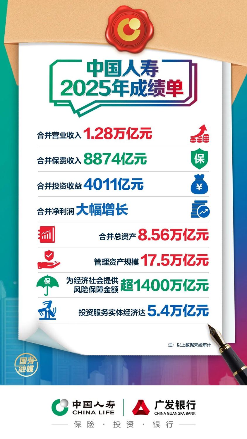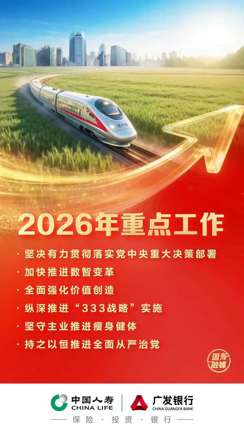 ![]() 工作会议快讯一 2026年1月28日至29日,中国人寿在京召开2026年工作会议、2026年全面从严治党暨纪检监察工作会议,并对获得2025年度“中国人寿高质量发展突出贡献奖”的单位和个人进行表彰。会议深入贯彻党的二十大和二十届历次全会精神、二十届中央纪委五次全会精神,认真落实中央经济工作会议及全国金融系统工作会议部署,动员引领广大干部员工凝心聚力、乘势而上,以“十五五”良好开局服务中国式现代化。中国人寿集团党委书记、董事长蔡希良参加会议并讲话,党委副书记、总裁李祝用主持会议并总结,党委副书记、执行董事张璐主持表彰仪式,驻中国人寿纪检监察组组长、党委委员仲晖林参加会议并讲话。 ![]() 会议指出 ![]() ![]() 集团党委书记、董事长 蔡希良讲话 会议强调 会议强调 全系统要全力做好2026年重点工作,坚决有力贯彻落实党中央重大决策部署,加快推进数智变革,全面强化价值创造,纵深推进集团“333战略”实施,坚守主业推进瘦身健体,持之以恒推进全面从严治党。全力实现经营业绩稳中有进、新增长极培育加力加速、数智变革成效初见、风险防控扎实有效等高质量发展目标,为中国式现代化贡献国寿力量。 ![]() ![]() 集团党委副书记、总裁 李祝用总结讲话 会议部署了2026年各业务板块经营管理目标,强调各单位要准确把握年度工作总体要求,切实增强数智变革的责任感使命感紧迫感,积极担当作为,抓好重点任务落地见效,确保“十五五”开好局起好步。 ![]() 全面从严治党暨纪检监察工作会议传达了习近平总书记在二十届中央纪委五次全会上的重要讲话精神和全会部署要求,总结通报中国人寿2025年全面从严治党和纪检监察工作,对2026年中国人寿以更高标准更实举措推进全面从严治党和纪检监察工作作出部署。会议强调,要坚定不移把党中央重大决策部署落到实处,坚定不移树立和践行正确政绩观,坚定不移推进作风建设常态化长效化,坚定不移规范权力运行,坚定不移推进反腐败斗争,坚定不移压实全面从严治党政治责任,在提升政治监督质效、强化正风肃纪、走好中国特色反腐败之路、压实全面从严治党责任、锻造“四个过硬”铁军上下更大功夫,为中国人寿“十五五”开好局起好步提供坚强保障。 ![]() 驻中国人寿纪检监察组组长、党委委员 仲晖林讲话 ![]() 会议期间,中国人寿集团党委授予全集团50个单位和50名个人2025年度“中国人寿高质量发展突出贡献奖”。集团党委班子成员为受表彰的单位和个人代表颁发奖牌、证书,并与获奖代表合影。5名受表彰代表作了分享发言。 ![]() 集团党委副书记、执行董事 张璐主持表彰仪式 中组部、中央金融办、中央金融工委、中央金融纪检监察工委、财政部、审计署、金融监管总局等有关同志到会指导。 中国人寿集团党委班子成员,高级管理人员,股权董事,驻中国人寿纪检监察组副组长,集团公司各部门主要负责人、党委巡视组组长、上海管理总部和雄安金融发展中心负责人,各直属单位和广发银行党委班子成员、高级管理人员,寿险公司、广发银行、财险公司、养老险公司省级机构主要负责人,其他直属单位京内重要子公司主要负责人,在京各直属单位相关部门主要负责人等在现场参会,并参加分组讨论。集团公司和各单位总部其他部门级人员,省级机构班子成员等在视频分会场参会。 注:以上数据未经审计