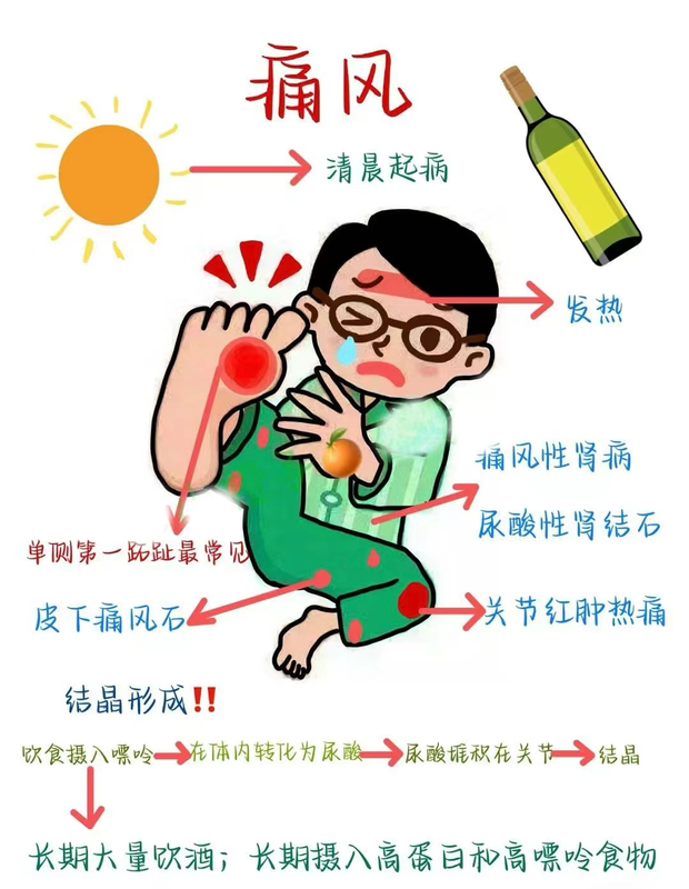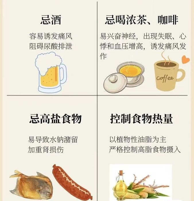 ![]() 痛风(gout)是因血尿水平过高导致尿酸结晶沉淀在关节内而引发的一种疾病,沉积的结晶导致关节内和关节周围出现疼痛性炎症发作。痛风石(tophi)是痛风的特征性临床表现,常见于耳廓、指尖、掌指、肘等关节、跟腱、髌骨滑囊等处。 这一疾病与嘌呤代谢紊乱及(或)尿酸排泄减少所致的高尿酸血症直接相关,主要临床特征为血尿酸升高、反复发作性急性关节炎、痛风石,可并发肾脏病变,严重者可出现关节破坏、肾功能损害,常伴发高脂血症、高血压病、糖尿病、动脉硬化及冠心病等。痛风往往会影响患者的日常工作、生活、除了严格遵医嘱按时用药以外,患者的自我管理、对饮食及生活方式的控制具有重要意义。 那么,痛风患者应该怎么吃呢? 01、痛风患者的饮食 低嘌呤饮食 嘌呤是体内尿酸的主要来源,因此减少嘌呤摄入是痛风饮食护理的关键。应尽量避免高嘌呤食物,如动物内脏、海鲜、红肉等。多食用低嘌呤食品,如蔬菜、水果、全谷类等。 适量蛋白质摄入 蛋白质是人体必需的营养素,但对于痛风患者来说,摄入量应适度。高蛋白食品如肉类、鱼类等含有较高的嘌呤,应适量食用。同时,可适量摄入牛奶、鸡蛋等低嘌呤蛋白质食品。 限制脂肪摄入 脂肪摄入过多会影响尿酸的排泄,因此应限制脂肪摄入。建议选择健康的脂肪来源,如橄榄油、鱼油等,并控制烹饪用油的总量。此外,应尽量避免摄入反式脂肪和饱和脂肪。 保持水分充足 充足的水分摄入有助于尿酸的排泄,建议每日饮水量至少2000毫升。可适当饮用淡茶、无糖饮料等,避免饮用含糖饮料和酒精类饮品。 增加新鲜蔬菜和水果的摄入 蔬菜和水果富含维生素、矿物质和膳食纤维,有助于维持身体健康。同时,它们也是低嘌呤食品,适合痛风患者食用。建议每日摄入足够的蔬菜和水果,特别是富含维生素c的水果。 避免饮酒和含糖饮料 饮酒和含糖饮料是痛风患者应避免的食品。酒精和含糖饮料不仅含有高嘌呤,还可能抑制尿酸排泄,加重病情。因此,痛风患者应彻底戒酒,避免饮用含糖饮料。 避免过度饥饿和暴饮暴食 过度饥饿和暴饮暴食都不利于痛风的管理。饥饿时,身体会加速脂肪和蛋白质的分解,产生大量尿酸;暴饮暴食则可能导致短时间内尿酸急剧升高。因此,应保持规律的饮食习惯,避免过度饥饿或暴饮暴食。 逐步调整饮食习惯 饮食习惯的调整是一个渐进的过程,不可急于求成。患者应逐步减少高嘌呤食品的摄入,增加低嘌呤食品的摄入。同时,保持适度的饮食量,避免过度饥饿或暴饮暴食。在调整饮食习惯的过程中,如遇到不适或病情反复,应及时就医。 ![]() ![]() 02、调整饮食习惯的原则 调整饮食习惯及生活方式有助于痛风的预防和治疗,痛风患者应遵循下述原则: 保持体重 规律饮食和作息 规律运动 禁烟 停用可导致尿酸升高的药物