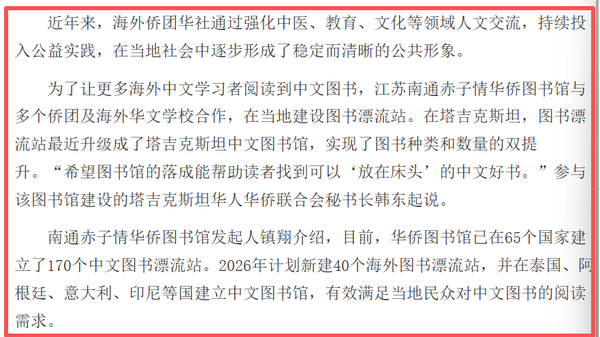 在这篇报道中,华侨图书馆的海外图书漂流与中文图书馆建设工作被重点关注、专门报道。这已是近两年内,项目继新华社、人民网等中央级权威媒体报道后,再次获得国家级媒体关注与传播,充分展现了华侨图书馆在海外文化公益领域的持续影响力。 从初心起航到书香致远,华侨图书馆以中文书籍为纽带,跨越山海、联通中外,让阅读成为连接世界的温暖力量。 《人民日报海外版》在报道中指出,海外侨胞的慈善观正从“济亲助乡”向“达则兼济天下”转变,而华侨图书馆正是这一理念的生动体现。 报道中特别提到: ![]() 公益暖人心,书香传友谊。 华侨图书馆作为纯公益文化项目,以图书为载体,让海外民众在阅读中感受中华文化的魅力,在交流中增进理解与认同,生动展现了海外侨胞的慈善情怀与公益担当。 65国170站 全球中文阅读网络初具规模 华侨图书馆自2019年创办以来,始终坚守公益初心。2021年正式启动海外图书漂流项目至今,已在全球65个国家建立起170个中文图书漂流站,为广大海外侨胞与中文学习者提供优质中文读物,搭建起温暖便捷的中文阅读空间。 每一座漂流站,都是海外的文化小站;每一本流转的图书,都是无声的文化交流。 面向2026年,华侨图书馆也明确了新的发展目标:计划新建40个中文图书漂流站,并在泰国、阿根廷、马来西亚、印尼等多个国家推动标准化中文图书馆建设,进一步扩大覆盖、优化服务,让更多海外民众近距离接触中文、了解中华文化。 以书为桥 彰显新时代侨胞担当 在发起人镇翔与各国侨领、志愿者的共同努力下,一批批中文书籍漂向海外,一个个漂流站在当地落地生根,塔吉克斯坦等站点更是实现从漂流站到标准化中文图书馆的升级。 公益不在于一时之举,而在于长久坚守;不在于规模大小,而在于真诚付出。华侨图书馆以实实在在的行动,在海外播撒阅读的种子,以书香为桥,促进中外民心相通、文明互鉴。 载誉前行 坚守初心再出发 多次获得央媒关注,是鼓励,更是前行的动力。 未来,华侨图书馆将继续坚守公益定位,深耕海外中文阅读推广,不断完善全球服务网络,用一本本承载温度与情怀的中文好书,持续搭建中外文化交流的坚实桥梁,让中华文化在世界各地更好地传播与绽放。