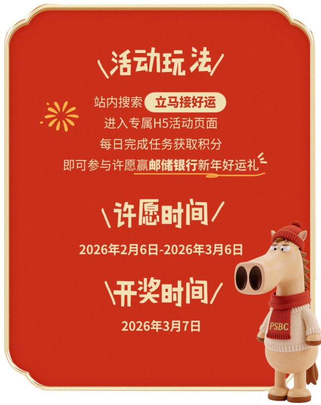 ![]() 邮储银行携手小红书花式整活啦 「立马接好运」活动正式启动 瞧,伴随着春的暖意 「立马」已经带着满满的福气 奔向全国各地 商圈里、车站内 还有遍布城乡的邮储银行网点 「立马」可能就在你身边 想知道怎么把礼品抱回家 别着急 三步解锁好运,小白秒上手 1.搜话题挖灵感 打开小红书站内搜索「立马接好运」,刷一波邮储银行的好运笔记!不管是抄作业还是攒素材,看完灵感直接爆棚。 2.带话题晒故事 晒出你的春运专属记忆!抢票成功的截图瞬间、回家路上的治愈vlog、带给家人的新年礼物……只要带上#立马接好运话题发笔记,就能有机会参加抽奖! 3.找「立马」拍合影 发现身边的「立马」元素就冲冲冲!邮储银行网点、商圈户外大屏、地铁站、公交站等的「立马」系列海报,拍个合影/小视频发小红书,锁定好运buff! ![]() 好礼暖心派送 等你接好运 黄金小金豆 谁能拒绝金灿灿的马年好运,攒福气又保值! 「立马」定制周边 超萌又实用的ip周边,马年氛围感直接拉满! ![]() 现在就冲小红书 搜「立马接好运」 这个春节 让「立马」陪你接满一整年的好运!