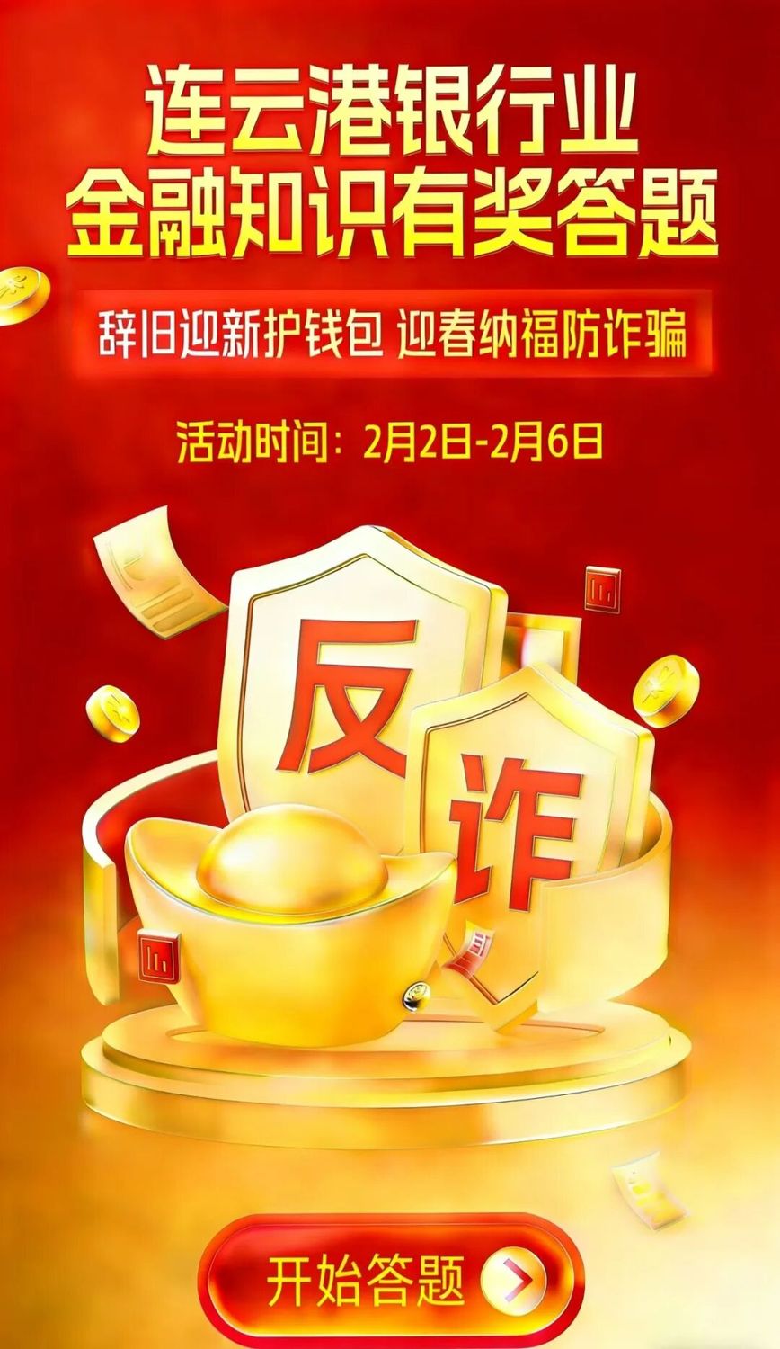 ![]() 连云港市银行业协会 金融知识有奖答题活动 即将开始啦 参与答题就有机会赢得奖品 快来参与吧! 参与方式 ![]() 第一步: 用微信扫描上方二维码 进入公众号凯发k8娱乐官网app下载主页面 第二步: 点击右下角菜单栏“行业脉动-有奖答题” 即可进入答题页面 01活动主题 “辞旧迎新护钱包 迎春纳福防诈骗” 02活动时间 2026年2月2日(上午9:00)——2026年2月6日(下午5:00),共5天。 03竞答内容 聚焦春节期间高发的金融诈骗类型,同时普及银行atm机取款安全、手机银行转账安全。 04竞答规则 · 进入答题页面后,由题库随机抽取10道题,题型包括单选题、多选题、判断题。 · 答题完成后,系统显示答题得分和用时。 · 答题规则:每人每天可参与3次挑战答题。 · 抽奖规则:答题100分即可参加抽奖,每月同一个手机号、同一个收货地址,仅限中奖一次。 05奖项设置 · 活动共设30份奖品。 · 答题竞赛结束后,连云港市银行业协会将根据获奖者登记的信息邮寄奖品。