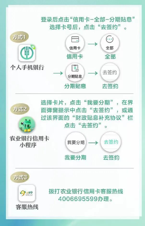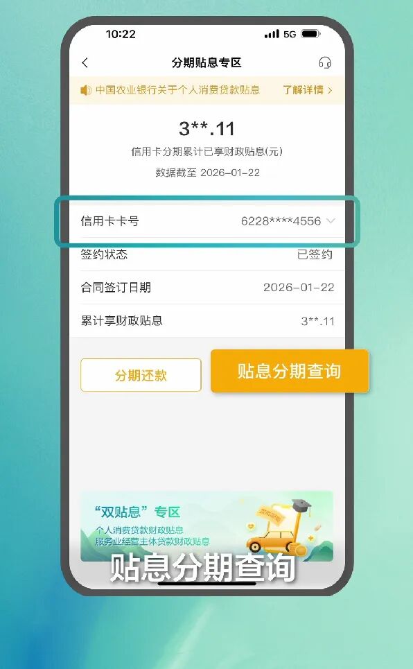 个人消费贷款财政贴息政策重磅升级!政策截止日期从2026年8月31日延长至2026年12月31日,信用卡账单分期(仅支持人民币账单,含总账分期)正式纳入贴息范围! 如何申请信用卡账单分期贴息,你关心的热点问题都在这里。 哪些账单分期可以享受贴息? 农行客服小姐姐: 您在2026年1月1日至2026年12月31日期间新办理的信用卡账单分期(含总账分期),且在此期间生成的各期账单,经识别真实性、合规性后可以享受。 可以享受多少贴息? 农行客服小姐姐: 年贴息比例为1%,且最高不超过办理分期时约定的年化利率的50%。信用卡账单分期贴息与个人消费贷款贴息一起,一年最多可省3000元! 怎么申请账单分期贴息? 农行客服小姐姐: 您需与农业银行签署《中国农业银行信用卡账单分期财政贴息补充协议》,每张信用卡需单独签署。签约后,您满足条件的账单分期(含总账分期),可按规定享受财政贴息。贴息资金会在每期账单生成时自动扣减,无需您额外操作。 您可以通过农业银行手机银行、农业银行信用卡小程序或信用卡客服热线4006695599等渠道办理签约。 ![]() 申请后怎么知道省了多少钱? 农行客服小姐姐: 您可拨打农业银行信用卡客服热线4006695599或通过农业银行手机银行凯发k8娱乐凯发k8娱乐官网app下载官网app下载首页点击信用卡-全部-分期贴息-选择卡号-贴息分期查询,查询具体金额。(您还可搜索“贴息”,点击分期贴息签约,选择卡号,查询具体金额。) ![]() ![]() ![]() ![]() ![]() (左右滑动查看更多图片) 特别提醒: 农业银行不收取任何贴息办理费用,也不会委托任何第三方中介,请您通过农业银行官方渠道办理业务,保护好个人信息与财产安全。