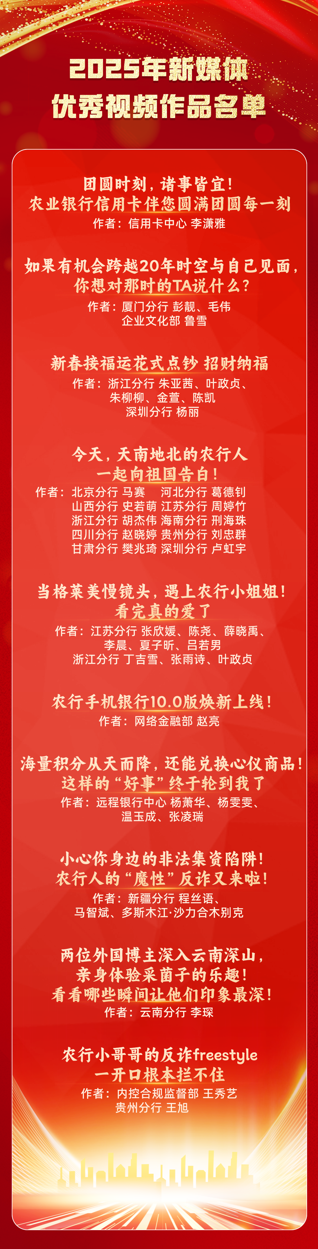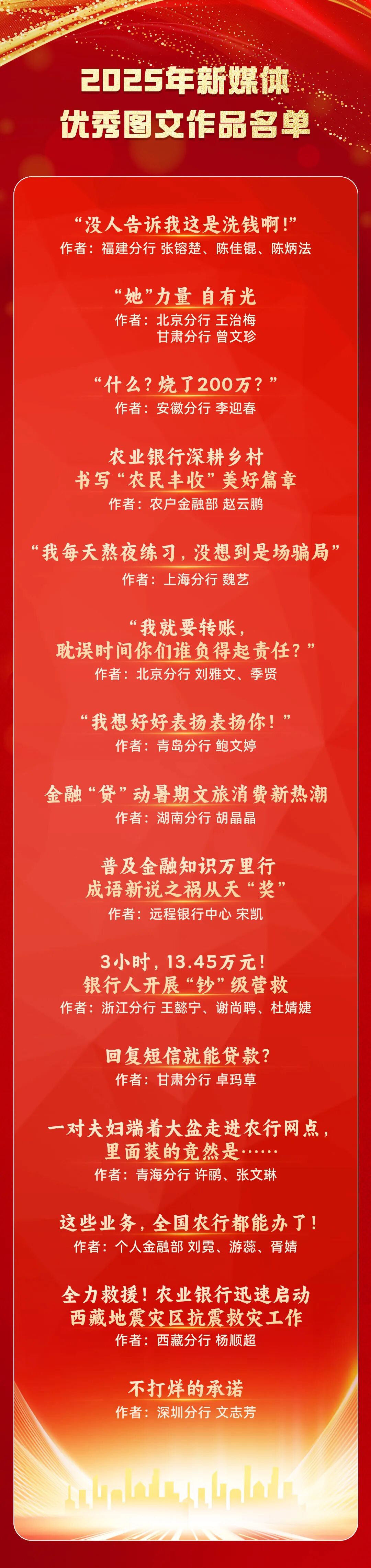 落笔有声 耕耘有果 2025年 农行人紧扣时代主题 以匠心铸精品 以初心传温度 在“中国农业银行”官方新媒体矩阵发布 548篇原创图文作品、119部视频作品 经过精心评选 15篇图文作品、10部视频作品 脱颖而出 获评2025年度农业银行新媒体优秀作品 今日榜单正式揭晓 快来看看 有没有你熟悉的那个故事 ![]() ![]() 2025年新媒体优秀图文作品精选 ![]() ![]() ![]() ![]() ![]() 2025年新媒体优秀视频作品精选 ![]() 上一篇: 农业银行开展离退休老干部走访慰问