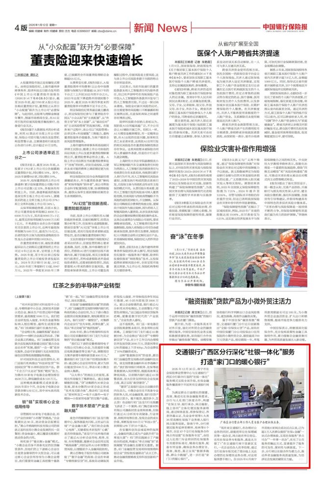近日,《中国银行保险报》刊发《交通银行广西区分行深化“社银一体化”服务 打造“家门口的暖心银行”》,报道了交行广西区分行与人社部门深度合作,构建“社保主导、银行承办、网点辐射、线上协同”立体化便民服务新格局,通过网络直连,将参保登记、养老待遇认证、失业金申领等5大类36项高频社保线下业务嵌入银行网点服务场景。 ![]() 《中国银行保险报》 1月12日 原文报道 2025年12月30日,南宁市社会保险事业管理中心与交通银行广西区分行联合打造的“社银一体化”服务模式实现全面升级,社保金融服务覆盖南宁市区所有交通银行网点。 为满足群众日益增长的便捷、高效、集成化社保金融服务需求,分行与人社部门深度合作,构建“社保主导、银行承办、网点辐射、线上协同”立体化便民服务新格局,通过网络直连,将参保登记、养老待遇认证、失业金申领等5大类36项高频社保线下业务嵌入银行网点服务场景。除南宁外,分行将便民服务延伸至柳州、桂林等8个城市,全区47个交行社保服务合作网点均设置“社保服务专区”,由经过人社部门专业培训的社保服务专员提供标准化、精准化服务,配备专用设备,确保业务办理安全、高效、规范,真正实现“数据多跑路,群众少跑腿”,进一步打造“家门口的暖心银行”。 “现在来交通银行,在办理对公业务的同时,就能把单位社保增减员等一起办妥,网点就在单位旁边,还有社保业务专柜服务,真是太方便了!”在交通银行南宁高新区支行,一名企业经办人员李经理,通过交行社保专柜完成了部分线上无法办理的社保增员业务办理,对这项服务赞不绝口。自2025年6月南宁市首批6家网点成功试点以来,已为超2万人次群众提供“社保 金融”一站式办理体验,实现社保服务“多点可办”“一件事一次办”,优化了公共服务的触达方式,显著提升了服务的可及性、便利性与满意度。下一步,分行将以社银合作为着力点,推动养老金融服务高质量发展,为经济社会发展贡献坚实力量。