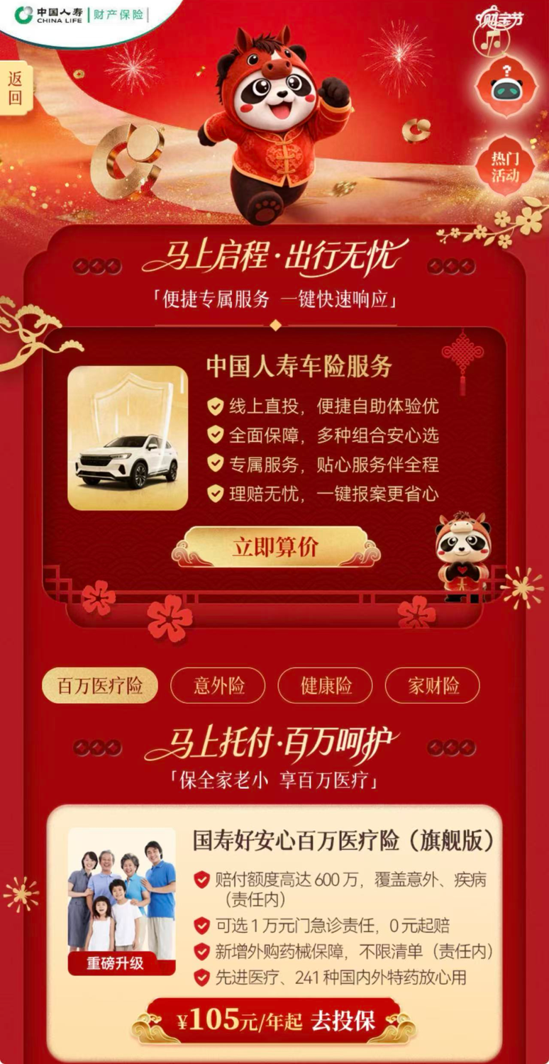 新春临近,中国人寿财险第六届“财宝节”已于近日启幕,将持续至3月31日。活动期间,中国人寿财险以自营线上平台为主要阵地,围绕广大人民群众在出行保障、医疗健康、意外风险与家庭财产等多场景的保障需求,打造“以人为本、四位一体”的保险产品矩阵。同时,通过一系列趣意盎然、形式多样的线上互动内容,激发客户投保兴趣,为佳节增添更多喜庆与安心。 ![]() 国潮互动焕新升级 打造新春年味盛宴 中国人寿财险紧扣新春节日特色,为丙午马年“财宝节”精心打造系列主题活动,将传统文化与现代数智交互深度融合,带来一场覆盖不同新春场景,集趣味性、互动性与福利性于一体的新春嘉年华。 活动贯穿整个春节,以多元化的数字玩法满足客户的差异化参与需求。客户可通过中国人寿财险“安心享”平台参与精彩活动。 例如,“马上绽放·烟花祈福”活动,在线点燃定制烟花并生成专属贺图分享,轻松传递新年愿景;“马上添福·好运过门”活动,挑战民俗竞速游戏,登上排行榜,在趣味互动中收获饱含安心出行寓意的祝福;“马上团圆·趣闹元宵”线上灯谜会,在元宵佳节氛围中猜谜参与抽奖,加深家庭财产安全理念。 作为中国人寿财险推进数字化客户经营与品牌年轻化的重要实践,本届“财宝节”将贴近生活的传统年俗转化为可参与、可分享的线上体验内容,满足客户对于祝福、互动与保障服务的多重需求。活动在提升客户节日参与感与获得感的同时,也展现中国人寿财险以科技赋能服务、以文化增强情感连接的全新探索,在浓浓年味中传递守护与陪伴的品牌温度。 产品矩阵持续优化 多维守护美好生活 本届“财宝节”不仅带来了丰富的互动体验,还同步推出完善的保障布局。围绕客户多层次的风险保障需求,中国人寿财险构建了覆盖多个生活场景的产品矩阵,以车险、意外险、健康险、家财险四大类别为核心,为个人与家庭提供系统化、一站式的综合保障凯发k8娱乐官网app下载的解决方案。 针对出行安全保障需求,车险产品通过保障责任组合与服务流程优化,为客户提供在线投保、咨询、理赔等可一键触达的车险服务,让车主在春运返乡、自驾出游等高频出行场景中更加安心。 针对日常与专项意外风险,中国人寿财险布局多类型意外保险产品,包括“神州畅游”旅游意外险、“童安心”少儿意外险、“长者无忧”中老年意外险等,关注不同年龄段人群的保障需求,为日常休闲、公共交通出行、自驾等多类生活场景提供针对性风险保护,在突发意外时帮助客户及时获得经济补偿与凯发k8娱乐官网app下载的服务支持。 在健康管理方面,中国人寿财险产品体系不断完善,围绕重大疾病、特定疾病、健康管理需求等维度,提供覆盖多层次客群的差异化保障选择。如:“孝安心•中老年人癌症医疗保险”“关爱脑•健康个人严重阿尔茨海默病住院医疗保险”“糖安心•糖尿病人医疗保险”“臻享人生高端医疗保险”等。为客户搭建“健康保障 健康服务”框架,与基本医保形成有效衔接,进一步提升个人与家庭的健康保障水平。 “国寿好安心百万医疗险(旗舰版)”“国寿好安心百万医疗险(0免赔版)”“中国人寿百万医疗险(免健告版)”等百万医疗险产品均推出家庭投保优惠,减轻重大疾病带来的家庭负担。 ![]() 在家庭财产风险防护方面,“中国人寿家财险”注重居家场景下的综合风险保障,可为房屋及室内财产可能面临的各种自然灾害、意外事故、盗抢及居家第三者责任等风险提供全面的保障方案,为家庭财产安全保驾护航,提升居家生活的安全感与幸福感。 通过对四类产品板块的系统整合与持续创新,中国人寿财险在本届“财宝节”中形成覆盖广、层次丰富、组合灵活的产品矩阵,致力满足不同人生阶段、不同家庭结构以及不同保障偏好的客户需求。 ![]() 坚持深化数智建设 科技创新引领发展 科技驱动全球金融变革,催生新型业态发展。中国人寿财险紧跟行业趋势,践行数字化转型战略,推动保险与科技深度融合,构建数字化创新体系。数字化发展已成为公司战略核心,是其转型升级、提升核心竞争力的必经之路。 在本届“财宝节”中,“安心享”自营平台不仅是线上活动的核心承载阵地,更是链接客户需求与公司数字化战略的关键枢纽。中国人寿财险“安心享”平台是集app、微信公众号、小程序三位一体的自营网络矩阵,致力于从传统线下服务,向“线上 线下”双轨服务转型;致力于从单一的客户服务,向满足客户全需求链条、全生命周期运营升级转型;致力于打造前中后端数智化运营平台,促进“保险 服务”升级;致力于用专业化服务传递温度,满足客户多元化服务需求,提升客户线上服务体验与客户经营效率。 在保险产品服务方面,“安心享”平台具备完善、丰富的保险产品与服务供给体系,针对不同客群差异化需求,提供家庭、车辆、财产、意外等专属风险凯发k8娱乐官网app下载的解决方案。并通过数字化、智能化能力支持国寿金选、风险测评、方案推荐等一站式保险管理服务。通过大数据、人工智能等先进技术的深度融合,平台已实现对用户需求的精准捕捉与个性化服务,为用户提供定制化的产品推荐和服务方案。 另一方面,中国人寿财险将数字化服务与普惠金融发展紧密结合,在保障供给、流程便捷和覆盖范围方面持续发力,以科技手