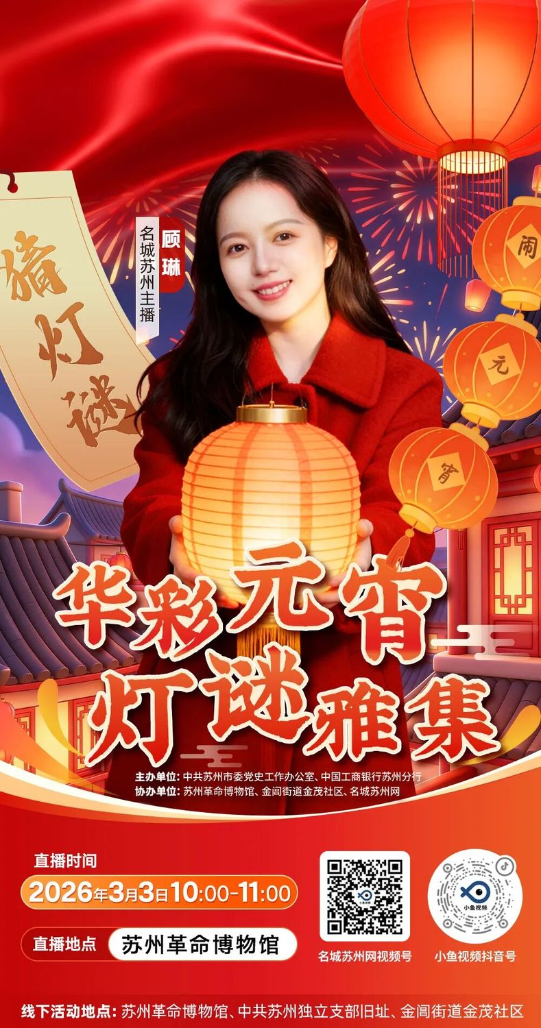 春归大地,灯火启年 当丙午马年的第一轮满月升空 元宵佳节便如期而至 值此良辰,共赴一场灯谜之约 打开元宵的华彩流光、猜谜雅趣 👇👇👇 华彩元宵 灯谜雅集 猜灯谜、吃汤圆、赏花灯……是元宵佳节的传统习俗,本届“华彩元宵 灯谜雅集”以灯谜为引,带大家沉浸式感受苏城的元宵氛围。活动灯谜谜面、谜底包含红色印记、传统文化、新年祝福、苏州元素,一起在谜中探索、发现灯谜雅趣吧~ “华彩元宵 灯谜雅集”元宵灯谜活动由中共苏州市委党史工作办公室与工商银行苏州分行共同主办,苏州革命博物馆、金阊街道金茂社区、名城苏州网协办。 往年活动图集 苏州的市民朋友可以在元宵节当天前往苏州革命博物馆、中共苏州独立支部旧址、金阊街道金茂社区党群服务中心参与活动,猜对灯谜即有机会领取一份汤圆或其它精美礼品。 无法线下参与活动的朋友,也可以一起线上猜灯谜、抽微信红包,讨些新年的好彩头!同时观看灯谜直播感受现场的热闹喜庆! 活动详细信息如下 👇👇👇 线上灯谜活动 ![]() 活动时间: 2026年2月28日-3月3日 9:00-17:00 活动规则: 1、每组3道题,全部答对,即有机会抽取现金红包奖励; 2、每人每天只有2次答题机会,中途退出当天无法继续答题; 3、活动期间,每人每天仅享有1次中奖机会; 4、扫描上图二维码或点击“阅读原文”参与活动。 线下灯谜活动 活动地点、时间: ![]() 1、苏州革命博物馆 (姑苏区三香路1216号) 3月3日9:00-16:00 ![]() 2、中共苏州独立支部旧址 (姑苏区体育场路4号) 3月3日9:00-16:00 ![]() 3、金阊街道金茂社区 党群服务中心 (姑苏区金门路777号) 3月3日13:00-15:00 活动规则: 1、答对一个灯谜,可领取精美礼品一份。 2、每人限领一份奖品。 3、礼品数量有限,先到先得、送完即止。 线上直播 ![]() 直播时间:2026年3月3日10:00-11:00 直播地点:苏州革命博物馆 直播平台:名城苏州网视频号、小鱼视频抖音号 转发分享给家人朋友 一起猜灯谜,闹元宵!