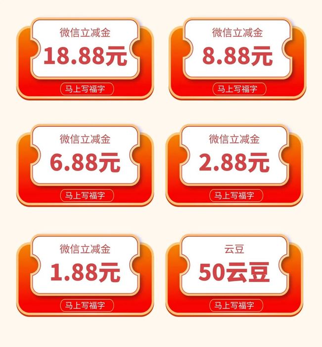 ![]() 开笔写福赢好礼 —云管家粉丝节— 壹 活动时间 2026年02月02日9:00:00至2026年02月09日23:59:59 贰 活动对象 “工银江苏金融云管家”公众号注册用户。 叁 活动规则 活动入口 微信关注“工银江苏金融云管家”公众号,活动期间,您可以通过菜单栏【惠生活】-【马上写福字】、关键字回复“写福字”进入活动。 ![]() 抽奖规则 活动期间每人一次抽奖机会。云管家注册用户可参与抽奖。 如果您是新用户,请您在公众号上注册手机号码后再进入抽奖喔!(注:老用户如未注册手机号也需先注册手机号码,成为注册用户后参与抽奖。) 【注册手机号码】 关注“工银江苏金融云管家”微信公众号,通过菜单栏【惠生活】-【云豆商城】-“我的云豆”注册手机号码。 奖项设置 本次活动设置18.88元/8.88元/6.88元/2.88元/1.88元微信立减金和50云豆共6个奖项。 ![]() 肆 领奖方式 微信立减金使用与领取方式 1、客户使用工商银行江苏省分行借记卡进行微信支付,单笔消费满19元减18.88元立减金、满9元减8.88元立减金、满7元减6.88元立减金、满3元减2.88元立减金、满2元减1.88元立减金。 2、立减金只可在中国境内商户使用,少数特定商户(包括但不限于:coco奶茶、优衣库、星巴克、肯德基、必胜客、同程艺龙、热风、太平鸟、孩子王、航联保险、华为商城、miss sixty、 ochirly、apple商城、fve plus、信用卡还款、零钱通、理材通等)、以及社交支付(如转账、红包、个人收款码专付等)、含单支付(微信支付订单号为44开头的交易)无法使用立减金;中国境外商户无法使用立减金。使用仅限主动付款订单生效,其他免密支付、他人代付的订单及微信余额支付功能关闭不可参加。订单支付仅指支付成功的交易,交易失败、未付款、退款交易无法使用微信立减金。 3、获赠的微信立减金自动存入客户微信卡包,可在“微信-我-卡包-券和礼品”里查看,微信立减金自获取之日起(含当天)有效期为7个自然日,立减金不开发票、不设找零、不可兑换现金,过期自动失效,不再重新领取,不予补发。交易日期以微信系统记录的交易时间为准。 4、使用立减金完成支付的订单如发生退货,全额退款的,将退回该笔订单的实际支付金额及立减金;部分退款的,则按比例退还客户实际支付的金额,不退还立减金。退款时如立减金已过期,则不予退还。 免责声明及中奖资格 如发现有利用活动规则恶意套取奖励的客户,工行保留追究其法律责任的权利。在法律许可范围内,中国工商银行有权修订本活动相关内容(包括但不限于参加资格、活动时间及奖励方式等)、暂停或取消本活动、并经相关途径(如工行网站、手机银行、微信公众号等)公告后生效。您若有业务方面的问题和咨询,可拨打工行客服电话:95588。或在公众号上输入“客服”,工行智能客服工小智将为您提供7*24小时服务。