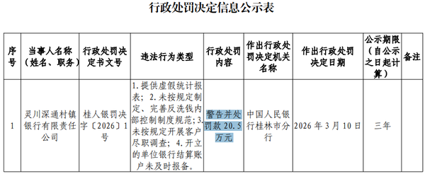 中国人民银行广西壮族自治区分行网站昨日公布的中国人民银行桂林市分行行政处罚决定信息公示表显示,灵川深通村镇银行有限责任公司提供虚假统计报表;未按规定制定、完善反洗钱内部控制制度规范;未按规定开展客户尽职调查;开立的单位银行结算账户未及时报备。 中国人民银行桂林市分行对灵川深通村镇银行有限责任公司警告并处罚款20.5万元。 天眼查显示,灵川深通村镇银行有限责任公司第一大股东为深圳农村商业银行股份有限公司,持股比例为61%。 以下为原文: ![]() 下一篇: 再去沛县唱大风