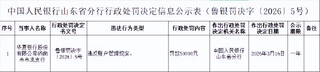 3月19日,中国人民银行山东省分行行政处罚决定信息公示表显示,华夏银行股份有限公司济南市市北支行因违反账户管理规定,被中国人民银行山东省分行罚款50000元。