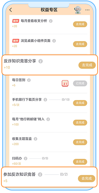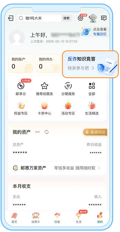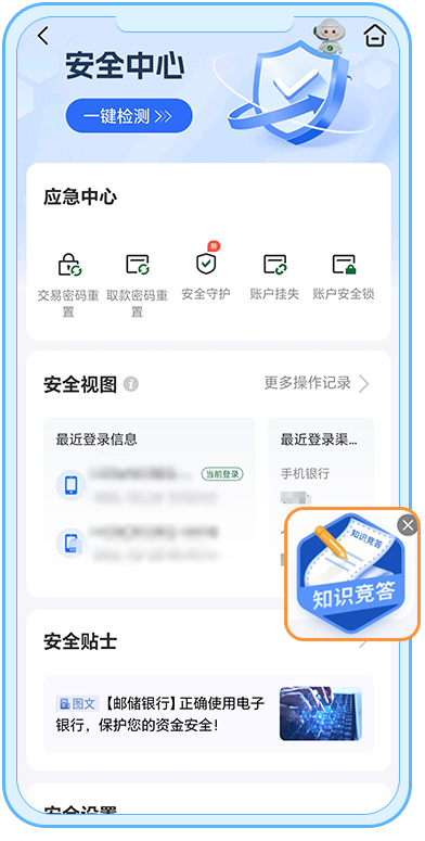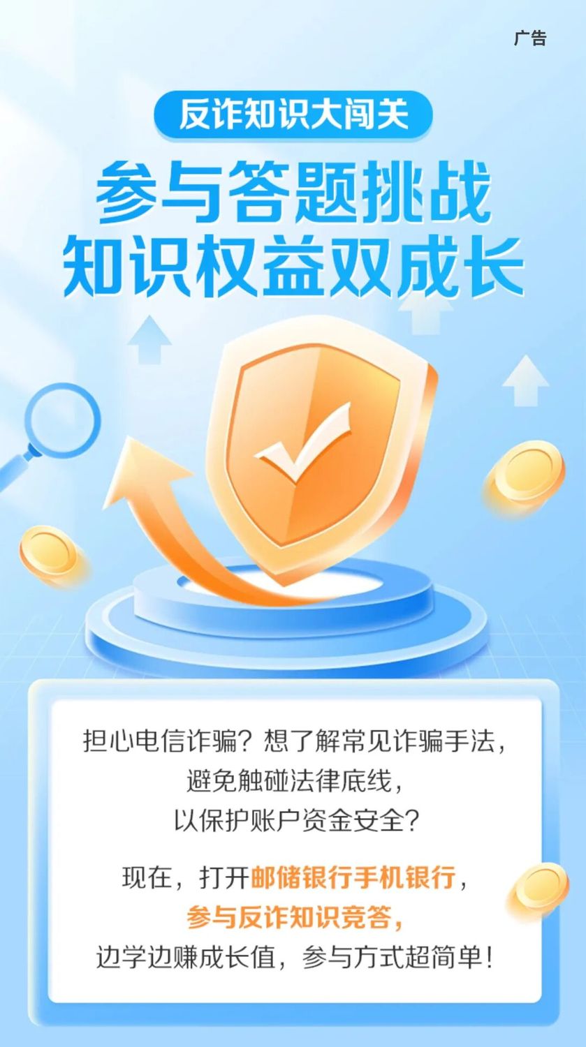 ![]() 参与规则 每月轻松玩,知识涨不停 01 每月一答,轻松学知识 每次5题,几分钟快速答题,积少成多学知识,掌握实用安全技巧。 02 主题闯关,赚取成长值 1个月周期内,答题正确1次累积5成长值,上限2次/月,累计成长值可提升权益专区等级。 03 分享加码,获加倍成长 分享答题链接邀请微信好友参与,额外得10成长值,助ta提升安全意识。 答题入口 入口1 手机银行【我的】页面 → 反诈知识竞答 ![]() 入口2 手机银行【我的-设置-安全中心】页面 → 知识竞答 ![]() 入口3 手机银行搜索框直接搜索 “反诈知识竞答” ![]() 入口4 手机银行【我的-权益专区-升级攻略-基础功能】页面 → 任务入口 ![]() 每天几分钟 知识变成长值,安全变习惯 和我们一起 积极防御,畅享数字生活! 立即参与 成为安全达人,守护您的数字资产! 期待您的加入! ![]() 扫码下载邮储银行手机银行