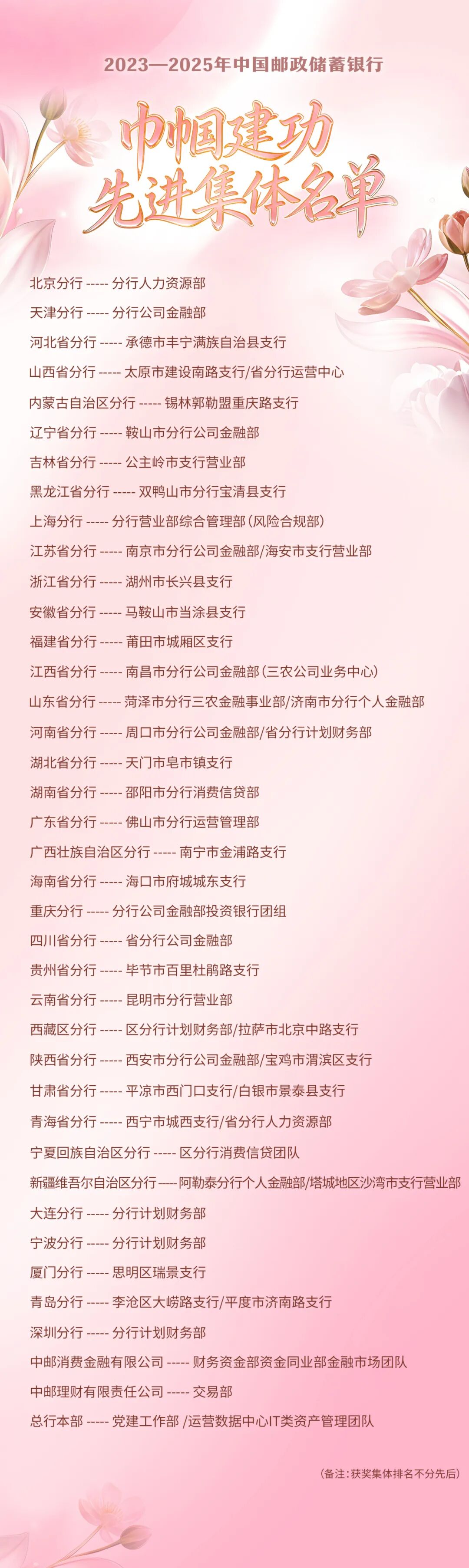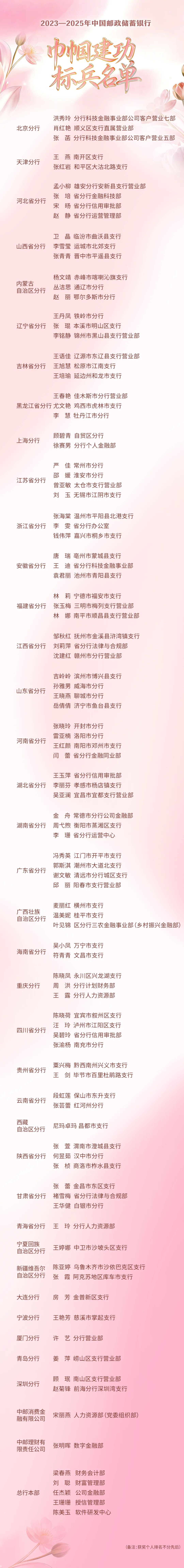 ![]() 她们,是职场上的铿锵玫瑰 在平凡的岗位上绽放非凡光彩 她们,是推动企业发展的“半边天” 用智慧和汗水 书写着新时代女性的卓越篇章 为大力弘扬劳模精神,彰显女职工在企业发展中作出的突出贡献,充分发挥先进女职工的榜样引领作用,激励女职工在企业发展中创先争优、建功立业,中国邮政储蓄银行正式揭晓了2023—2025年中国邮政储蓄银行巾帼建功先进集体和巾帼建功标兵评选结果! 荣耀榜单,正式揭晓! women's day 授予全行50个集体“中国邮政储蓄银行巾帼建功先进集体”荣誉称号。这些集体以卓越的团队协作和出色的工作业绩,展现了巾帼团队的强大合力。 授予全行100名个人“中国邮政储蓄银行巾帼建功标兵”称号。她们在各自的岗位上锐意进取,以精湛的业务能力和无私的奉献精神,成为全行女职工的杰出代表。 向所有奋斗中的邮储巾帼致敬! 榜样引领,续写华章! women's day 表彰是为了更好地出发。希望受到表彰的先进集体和个人,珍视荣誉,再接再厉,继续在推进邮储银行高质量发展的新征程上发挥示范引领作用,再创佳绩!也让我们所有人以她们为榜样,汲取奋进力量,在各自的赛道上不懈努力、接续奋斗! 到底谁是我们身边的巾帼榜样?现在就让我们一起来看看,这份荣誉榜单上都有谁! ![]() ![]() 你身边有获奖的姐妹吗? 或者你本人就是获奖人? 欢迎在留言区举举手 或者送上你的祝福与敬意~ 再次祝贺以上获奖的集体和个人! 向你们致敬!