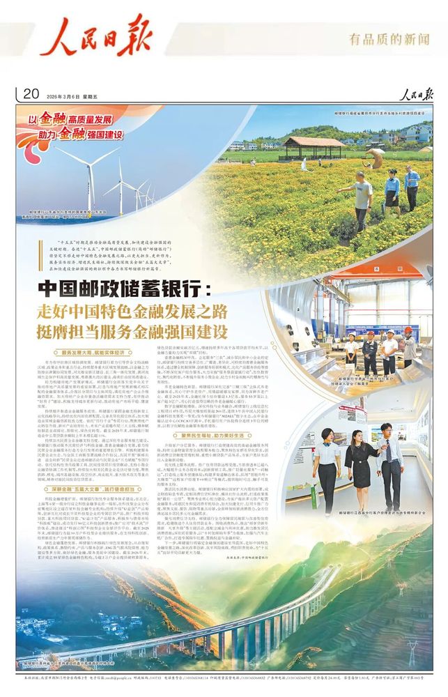 ![]() “十五五”时期是推动金融高质量发展、加快建设金融强国的关键时期。奋进“十五五”,中国邮政储蓄银行(简称“邮储银行”)将坚定不移走好中国特色金融发展之路,以更大担当、更新作为,服务实体经济、增进民生福祉,持续做深做实金融“五篇大文章”,在加快建设金融强国的新征程中奋力书写邮储银行新篇章。 01 服务发展大局 赋能实体经济 有力有序助推区域协调发展。邮储银行着力引导资金支持战略区域、政策业务和重点行业,持续服务重大区域发展战略,以金融之力助推京津冀协同发展、河北雄安新区建设、长三角一体化发展、黄河流域生态保护和高质量发展、粤港澳大湾区建设、海南自由贸易港建设。 ![]() 邮储银行贵州省分行支持建设的盘兴高速背武甲特大桥 助力构建房地产发展新模式。邮储银行全面落实党中央关于推动房地产高质量发展的重要部署,打造与房地产发展新模式相匹配的金融服务体系,合理区分项目与主体风险,满足房地产企业合理融资需求。加大房地产企业存量盘活融资需求支持力度,有序推动“好房子”建设,积极支持城市更新行动,推动房地产市场平稳、健康发展。 持续提升制造业金融服务质效。邮储银行紧跟金融支持新型工业化战略导向,持续优化内部资源配置,完善差异化授信体系,加大制造业领域金融资源投放力度。依托“百行千业”专项行动,聚焦传统产业转型升级、新兴产业培育壮大、未来产业前瞻布局三大主线,精准赋能制造业高端化、智能化、绿色化转型。截至2025年末,邮储银行制造业中长期贷款余额较上年末增长超11%。 ![]() 邮储银行山东省威海市分行贷款支持乳山风电一期项目 持续加大民营企业金融支持力度。通过深化专业服务能力建设,邮储银行推动服务民营经济与科技金融、普惠金融融合发展,着力将民营企业金融服务打造为全行发展的重要增长引擎。积极构建服务民营企业生态,与全国工商联签署战略合作协议,共同开展“联邮共进 益企向新”民营企业走进邮储活动与民营企业“五力赋能”专项行动。依托结构性货币政策工具、民间投资项目投贷联动、支持小微企业融资协调工作机制等,持续加大相关民营企业走访对接力度,聚焦铁路、核电、城市基础设施、低空经济、商业航天、重大技术攻关等重点领域,精准对接民间投资信贷需求。 02 深耕金融“五篇大文章” 践行使命担当 科技金融增量扩面。邮储银行加快专业服务体系建设,在北京、上海等6家一级分行设立科技金融事业部一级部,在科技型企业分布密集地区设立超百家科技金融专业机构;持续升级“u益创”产品矩阵,创新优化对成长早期科技型企业的专属信贷产品,推广科技并购贷款、重大科技项目贷款、“u益计划”产品服务,积极参与债券市场“科技板”建设,成功发行50亿元科技创新债券;推广应用“技术流”评价体系,推进建设“科创云图”科技型企业全景评价平台。截至2025年末,邮储银行为超10万户科技型企业提供服务,在支持科技创新、培育新质生产力中展现邮储作为。 ![]() 邮储银行兰州市分行客户经理走访高新技术企业 绿色金融蓬勃发展。邮储银行积极践行绿色发展理念,从治理架构、政策体系、激励约束、产品与服务创新、esg及气候风险管理、能力建设等多方面,做好绿色金融,服务美丽中国建设。截至2025年末,累计成立55家绿色金融特色机构,为超2万户企业提供碳核算服务,绿色贷款余额突破万亿元,增速持续多年高于各项贷款平均水平,以金融力量助力实现“双碳”目标。 ![]() 邮储银行江西省分行客户经理走访省级专精特新企业 普惠金融根深叶茂。立足服务“三农”、城乡居民和中小企业的定位,邮储银行持续完善多层次、广覆盖、差异化、可持续的普惠金融服务体系,通过健全机制保障、创新服务场景和模式、优化产品服务供给等措施,不断深化客户综合服务,大力实施“服务强县富镇行动”,加快数智化、集约化转型,不断提升服务小微企业、助力乡村全面振兴的精准性与有效性。 养老金融特色彰显。邮储银行深化完善“三横三纵”立体式养老金融体系,用心守护养老资产、用情温暖银发客群、用力深耕养老产业。截至2025年末,金融社保卡结存量超1.3亿张,服务55岁及以上客户超3亿户,用心打造值得信赖的养老金融暖心银行。 数字金融赋能增强。深化科技与业务融合,邮储银行上线信息化工程项目475项,布局大模型场景超260项,连续3年获中国人民银行金融科技发展奖一等奖;发布邮储银行“ai2all”数字生态,在中金金融认证中心(cfca)评测中,手机银行用户体验得分连续3年位列榜首,以数字化赋能金融服务提质增效。 03 聚焦民生福祉 助力美好生活 升级客户分层服务。邮储银行打造便捷高效的基础金融服务网络,持续完善财富管理全流程服务能力,聚焦特色客群差异化需求,创新消费信贷额度管理机制,重塑小额贷款产品体系,为客户美好生活注入金融新动能。 优化线上服务流程。推广住房贷款远程受理,当前渗透率已超八成,大幅提升业务办理效率;创新营销工具,推广轻量化服务“一码触达”,打造线上服务便捷体验;构建多渠道触达体系,拓展“智能外呼 大模型”“远程客户经理t 0响应”等模式,提供随时可达、触手可及的凯发k8娱乐官网app下载的服务支持。 激活民生消费动能。邮储银行积
