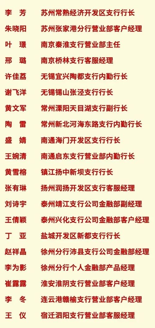 表彰名单 2024-2025年度中国农业银行江苏省分行 五一巾帼标兵岗和五一巾帼标兵 ![]() 近年来,农行江苏分行以习近平新时代中国特色社会主义思想为指导,认真贯彻党的二十大及二十届历次全会精神,深入贯彻总行、省分行党委各项决策部署,强化当表率、做示范、走在前的责任担当,在推动农行江苏分行高质量发展进程中,涌现出了一大批勇挑重担、攻坚克难、锐意进取、甘于奉献的优秀女员工集体和个人,发挥了“半边天”的重要作用。 为表彰先进、树立榜样,激励广大女员工立足新时代、担当新使命、展现新作为,省分行决定:授予苏州吴中木渎支行等13个集体中国农业银行江苏省分行五一巾帼标兵岗,授予李芳等20位同志中国农业银行江苏省分行五一巾帼标兵荣誉称号。 2024-2025年度江苏省分行 五一巾帼标兵岗名单 ![]() 2024-2025年度江苏省分行 五一巾帼标兵名单 ![]() 巾帼建功新时代 榜样引领新征程 让我们对标典型、看齐先进 勇于担当、团结拼搏 锚定“六个领先”奋斗目标 坚定不移推进“十二大变革” 为推进全行高质量发展 作出新的更大贡献! 上一篇: 叮!您有一份个人养老金专属礼包待领取!