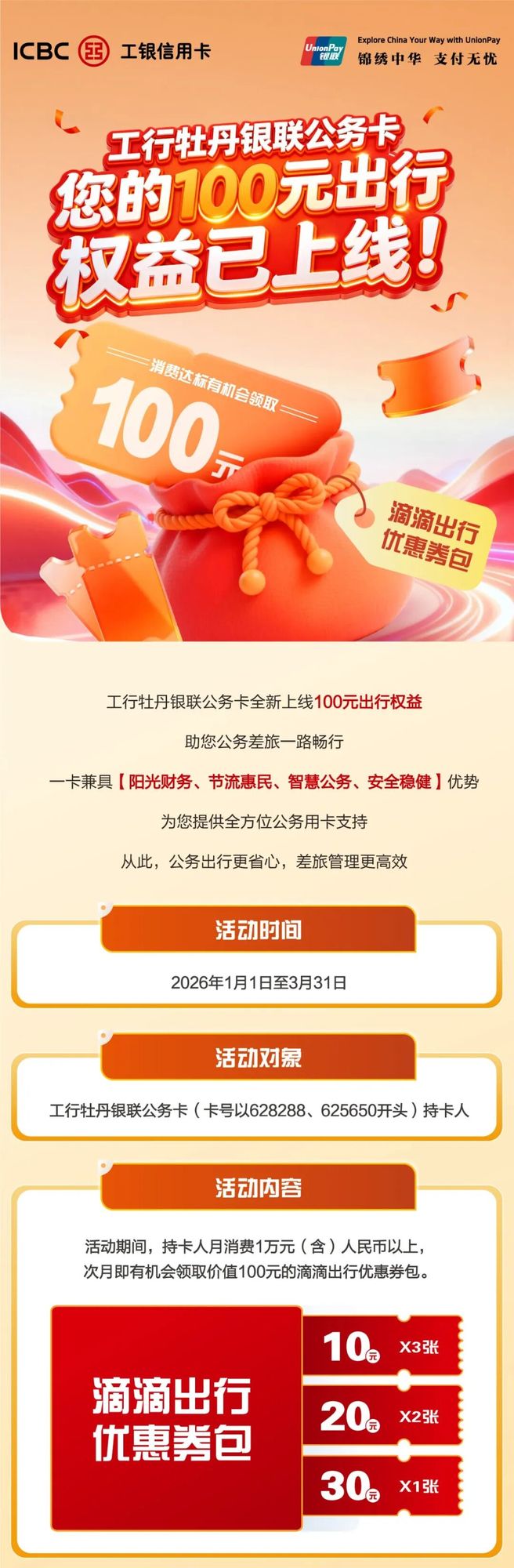 【好礼】您的100元出行权益已上线!工行牡丹银联公务卡消费达标有好礼 -凯发k8娱乐官网app下载