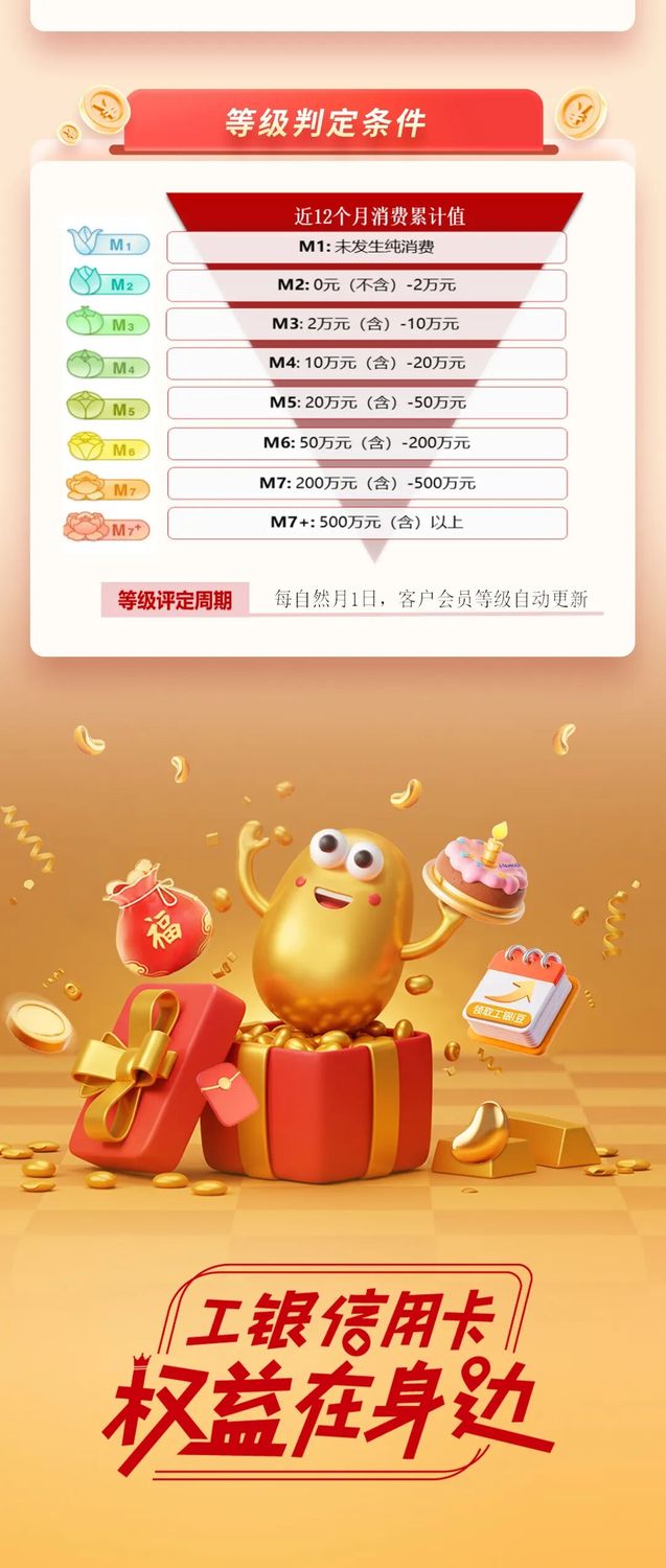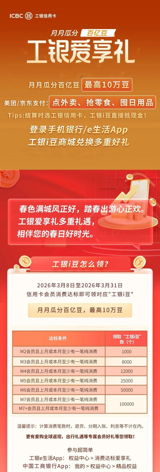 ![]() ![]() ![]() ![]() 向上滑动阅览 工银爱享礼各礼遇规则 活动时间 2026年3月8日10:00 至 2026年3月31日23:59:59 活动对象 工银信用卡有消费客户 活动内容 (1)成长增豆 m2-m4信用卡会员且上月或本月至少有一笔消费客户每月有机会领取工银i豆回馈,具体内容为:m2客户每月有机会领取1000豆;m3客户每月有机会领取8000豆;m4客户每月有机会领取1.2万豆。名额有限,先到先得。 温馨提示:上月或本月至少有一笔消费判断时:1.消费不包含分期入账、手续费、利息、退货等,具体以系统判定为准;2.系统判定持卡人当月消费笔数达标需要1-4个自然日,楼层页会显示【达标后领奖资格判断预计1-4日,具体以活动页面显示为准】 (2)月月豆涨 m5及以上信用卡会员且上月或本月至少有一笔消费每月有机会领取工银i豆回馈。其中m5客户每月有机会领取2.5万豆;m6客户每月有机会领取5万豆;m7及m7 客户每月有机会领取10万豆。名额有限,先到先得。 温馨提示:上月或本月至少有一笔消费判断时:1.消费不包含分期入账、手续费、利息、退货等,具体以系统判定为准;2.系统判定持卡人当月消费笔数达标需要1-4个自然日,楼层页会显示【达标后领奖资格判断预计1-4日,具体以活动页面显示为准】 ![]() (3)专属权益 专属权益内各活动以进入活动专区内细则显示为准。 活动细则 (一)同一身份证号、银行卡号、手机设备、手机号码,满足其中任意一个条件均视为同一客户。 (二)工银i豆相关说明。 1.通过“工银爱享礼”活动领取的工银i豆有效期为1年。每年12月底到期的“工银i豆”具体到期日为12月30日,其他月份到期的“工银i豆”具体到期日为到期当月最后一日。例如,2025年6月发放的消费积分转换为“工银i豆”后,在2026年6月30日(含)之前有效。 2.“工银i豆”可在中国工商银行手机银行“工银i豆”商城、工银e 生活app及e生活小程序“工银i豆”商城、指定特约商户和指定第三方平台等渠道兑换。具体兑换项目、兑换标准及兑换规则以各渠道兑换详情页面展示为准。可登录中国工商银行手机银行-我的-工银i豆或工银e生活-工银i豆查看具体情况。 (三)卡片被冻结、止付、收卡、销户,或发生欺诈、套现、逾期还款、对中国工商银行其他债务不偿还的、发生或涉嫌发生从事违法、违规、违反牡丹信用卡章程、领用合约或本活动办法及其他相关规定等情形的,即丧失参加本活动的资格,中国工商银行具有告知客户并采取相应法律措施的权利。 (四)根据业务发展、市场变化等原因,我行可动态调整活动容,具体以页面展示为准。 (五)各项购买的礼品/服务以服务详情页面规则的使用流程及相关第三方平台使用规则为准,一经领取或购买成功,除有特别说明、处理失败以外原则上不可取消、退还或更换,请务必在兑换前仔细确认订单内容。 (六)在中国法律许可范围内我行有权修改相关规则,包括但不限于活动时间、客户参加资格、回馈规则、奖励名额以及本规则其他内容、暂停或终止本活动,并按照法律法规及相关监管规定要求,经相关途径(如网站等)公告后生效。 (七)如有问题,可通过营业网点、门户网站或中国工商银行app在线客服咨询或拨打95588。 (八)我行与礼品/服务供应商间无合伙、经销、代理关系或共用出售人或保证人关系,本活动供应商所提供的礼品或服务的有关责任及凯发k8娱乐官网app下载的售后服务有关争议、纠纷等由各供应商负责。 ![]()