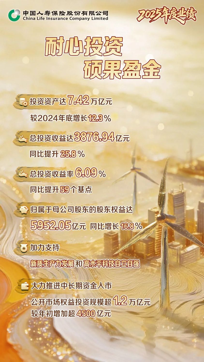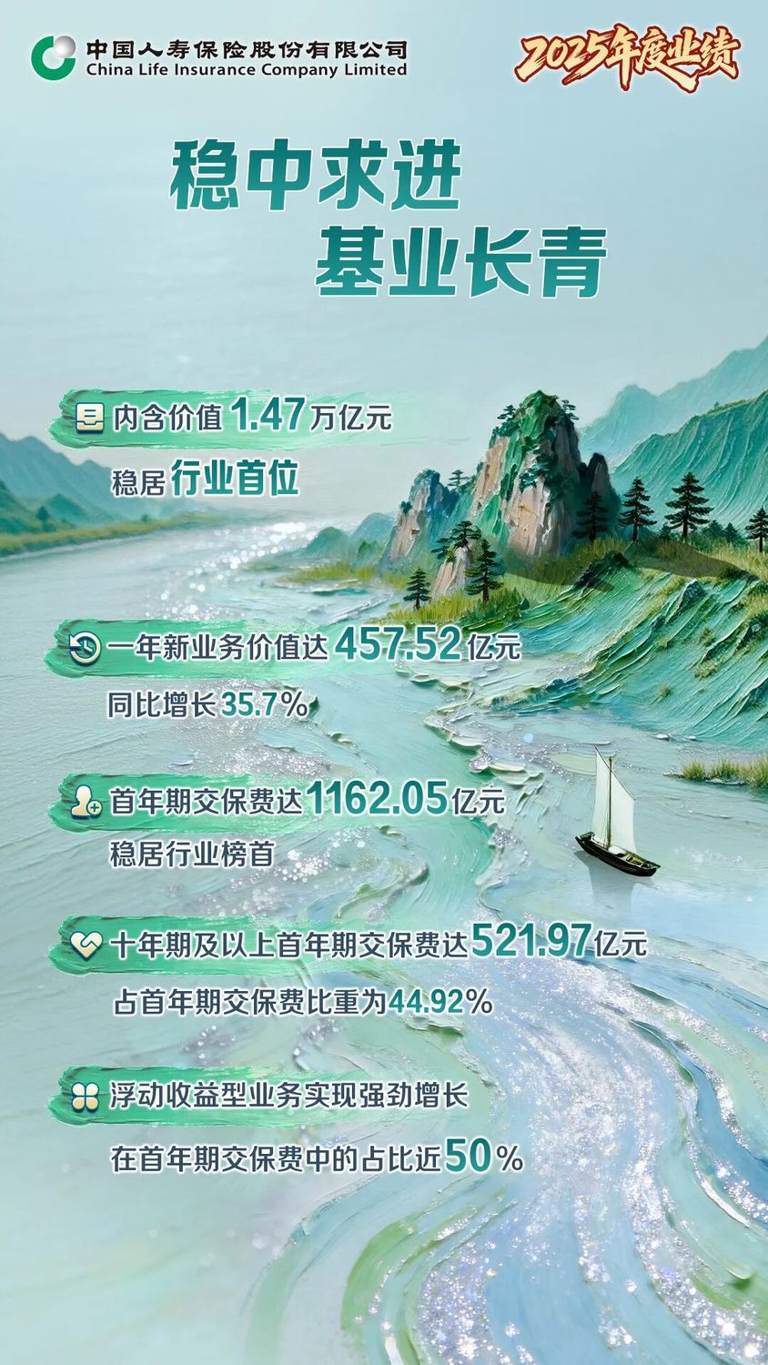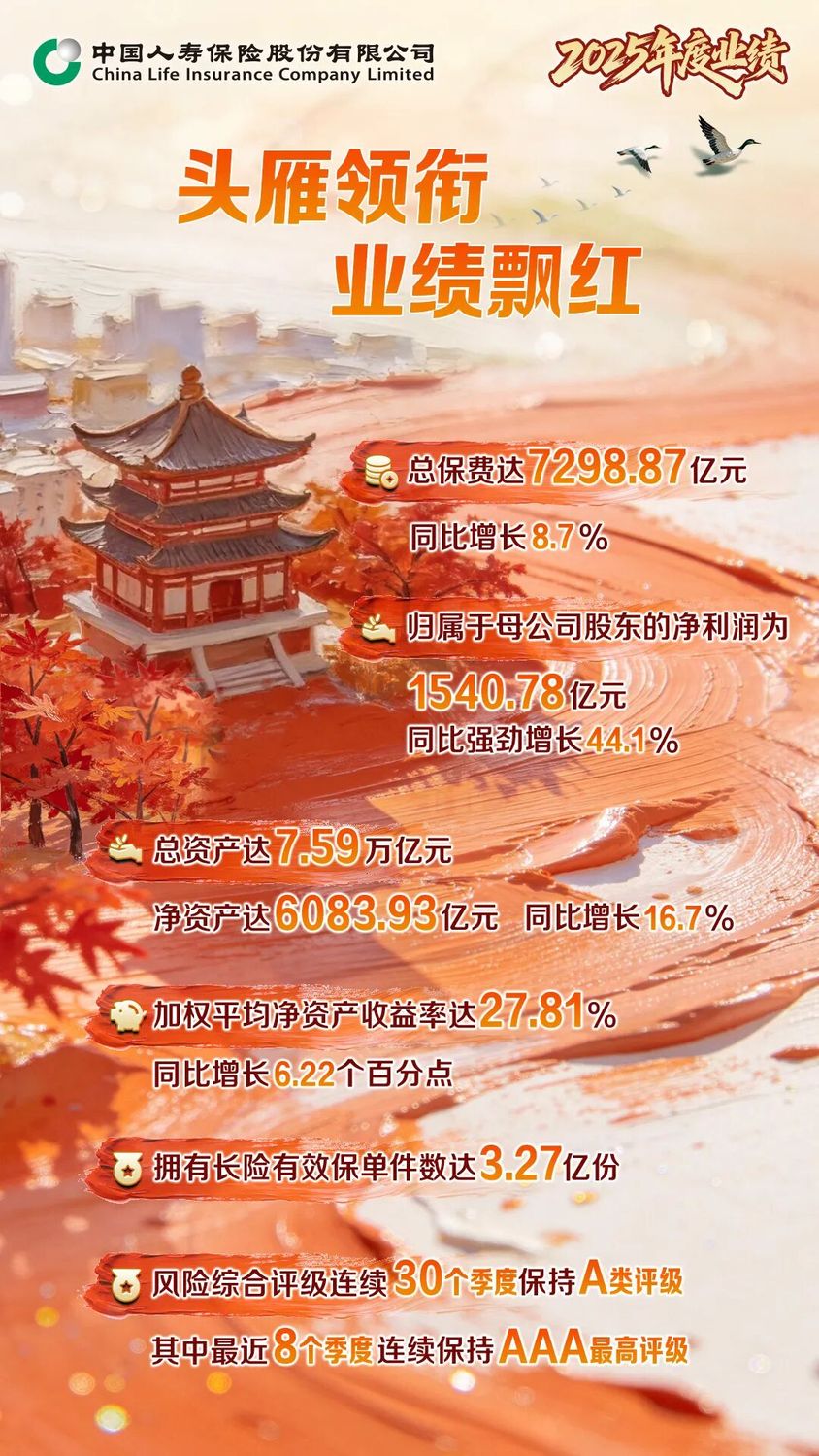 3月25日晚间,中国人寿集团旗下寿险公司发布2025年年度报告。 ![]() 2025年,面对更趋复杂多变的内外部形势,中国人寿寿险公司深入践行长期主义,遵循“三坚持”“三提升”“三突破”核心思路,持续加强资产负债管理,深化全渠道经营协同,加速推进重点领域改革,多项核心指标创历史新高,始终保持规模价值双领先地位,交出了一份速度与质量并举、结构与效益双优、发展与安全协同的亮丽答卷,实现“十四五”顺利收官。2025年,公司实现归属于母公司股东的净利润为1540.78亿元,在高基数基础上强劲增长44.1%,内含价值为1.47万亿元,稳居行业首位。 ![]() 业务发展再攀高峰。2025年,中国人寿寿险公司总保费首次突破7000亿元,达7298.87亿元,同比增长8.7%,较“十四五”首年提升超千亿元。首年期交保费达1162.05亿元,稳居行业榜首;长期竞争优势稳固,十年期及以上首年期交保费达521.97亿元,占首年期交保费比重为44.92%,其中,个险渠道十年期及以上首年期交保费占个险渠道首年期交保费比重超58%。持续推进营销体制改革,渠道转型释放活力,截至2025年12月31日,公司总销售人力63.8万人,规模保持行业首位,销售队伍职业化、专业化、年轻化水平不断提升。 业务结构多元均衡。全面构筑强大战略纵深,统筹推进全渠道协同发展,持续深化产品供给和业务发展形态多元、期限多元、成本多元,2025年,中国人寿寿险公司人寿保险、年金保险、健康保险新单保费比重分别为31.75%、32.11%、31.23%,实现均衡发展,公司市场竞争优势更加突出、发展韧性更强。积极应对市场利率环境变化,有力落实一揽子政策,新业务负债刚性成本连续三年稳步下降。大力推动业务结构转型,浮动收益型业务实现强劲增长,在首年期交保费中的占比近50%,业务结构转型顺利推进。 经营质效稳步提升。突出价值和效益导向,2025年一年新业务价值实现快速增长,同比提升35.7%,达457.52亿元,继续领跑行业。强化降本增效,加强精细化管理,费用投入产出效率显著提升。动态优化大类资产配置,投资收益大幅提高,实现近年最好投资业绩,总投资收益达3876.94亿元,较上年提升794.43亿元,同比提升25.8%,总投资收益率达6.09%,较上年同期上升59个基点。 综合实力持续增强。截至2025年12月31日,中国人寿寿险公司总资产、投资资产分别为7.59万亿元和7.42万亿元,在“十四五”期间均连续跨越三个万亿大关;归属于母公司股东的股东权益达5952.05亿元,同比增长16.8%;综合偿付能力充足率达174.01%,核心偿付能力充足率达128.77%,持续保持充足水平;公司拥有长险有效保单件数达3.27亿份。总市值、寿险和健康险准备金规模位居全球寿险公司首位。 ![]() 中国人寿寿险公司将资产负债管理理念贯穿经营管理各环节,资产负债联动不断深化。 此外,中国人寿寿险公司全渠道经营协同发力,形成多极驱动发展格局,核心竞争优势更加突出。个险渠道牢牢守住发展基本盘,继续发挥价值创造主力军作用;银保渠道有效发挥战略发展作用,规模价值强劲增长;团险渠道强化提质增效,经营效益有效提升;政策性健康险业务规模、城市定制型商业医疗险参与承保数量创历史新高;互联网保险业务实现快速增长。 ![]() 过去一年,中国人寿寿险公司荣获第十五届中国证券“金紫荆奖”卓越上市公司等奖项;位列标准普尔“全球寿险公司50强”第一;在保险公司风险综合评级中,连续30个季度保持a类评级,其中最近8个季度连续保持aaa最高评级;明晟(msci)esg评级跃升至aa级,可持续管理水平跻身全球领先行列。同时,公司重视与投资者共享高质量发展成果,董事会建议派发2025年末期现金股息每10股6.18元(含税),连同已派发的2025年中期现金股息,全年累计派息每10股8.56元(含税),分红总额达241.95亿元,同比提升31.7%。 稳固核心主渠道作用 个险渠道各项指标持续向好 深入践行高质量发展,个险渠道始终坚持价值引领,整体发展稳中有进,各项指标持续向好。同时,渠道加快转型升级步伐,业务结构更加多元。 ![]() 2025年,公司个险渠道总保费为5517.90亿元,同比增长4.3%;其中,续期保费为4422.85亿元,同比增长7.9%。首年期交保费为891.71亿元,十年期及以上首年期交保费为521.48亿元,占个险渠道首年期交保费的比重进一步提升至58.48%,业务结构持续改善,可持续发展能力进一步增强。大力推动浮动收益型产品发展,2025年分红险业务实现快速增长,占个险渠道首年期交保费的比重跃升至近60%,成为新单保费的重要支撑。主销产品逐步强化中长年期销售导向,缴费和保险期限更加多元。个险渠道首年期交保费险种和业务结构更加多元均衡。个险渠道一年新业务价值达392.99亿元,同比提升25.5%。 个险渠道坚持高质量发展导向,稳步推进营销体制改革,深耕队伍常态运作,稳固队伍管理阵型,强化优增优育,优化队伍结构,不断提升队伍硬实力,持续深化队伍职业化、专业化、年轻化转型。截至2025年12月31日,个险销售人力为58.7万人,队伍规模稳居行业首位,其中,营销队伍规模为37.1万人,收展队伍规模为21.6万人;队伍质态不断改善,优增人力同比增长40.0%,新生力量不断壮大。 有效发挥战略发展作用 银保新业务价值大幅提升 银保渠道主动满足客户养老传承和财富管理需求,同时推动渠道控本增效,实现保费规模、新业务价值大幅提升。坚持渠道全面布局,网点经营扩面提质。聚焦专业化建设,推动队伍质升量稳。