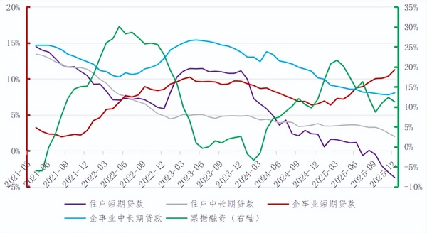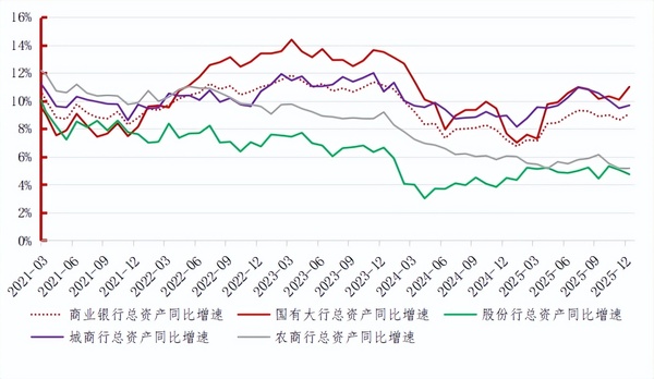 2025年银行业发展 回顾与展望 摘要 一、发展回顾 (一)资产负债平稳增长 商业银行资产负债规模保持平稳增长,增速同比略有提升。金融监管总局数据显示,2025年12月末国内商业银行境内总资产406.3万亿元,同比增长9.1%,增速较上年同期增加1.9个百分点;总负债同比增长9.3%,增速较上年同期增加2.1个百分点。分机构类型来看,国有大行和城商行增速继续维持高位,股份行增速最低但回升明显,农商行低位运行。国有大行、股份行、城商行、农商行总资产同比分别增长11.0%、4.7%、9.7%、5.2%,增幅较上年同期分别变化3.4、0.2、0.8、-0.9个百分点;总负债同比分别增长11.3%、4.7%、10.0%、5.5%,增幅较上年同期分别变化3.5、0.5、1.1、-0.5个百分点。 ![]() 图1 商业银行资产规模增速 ![]() 图2 商业银行负债规模增速 信贷增速稳中有降。人行统计数据显示,2025年末银行业金融机构本外币各项贷款余额275.7万亿元,同比增长6.2%,增速同比降低0.9个百分点。人民币贷款余额271.9万亿元,同比增长6.4%,增速同比降低1.2个百分点。分部门看,住户贷款增长乏力。人民币住户短期贷款、住户中长期贷款余额同比增速分别为-3.7%、2.0%,增速同比分别下降6.0、1.8个百分点,反映出居民消费及住房需求仍有待修复,政策刺激效果有待进一步释放。企(事)业短、中长贷款及融资保持较快增长。企(事)业短期贷款、企(事)业中长期贷款、票据融资余额同比增速分别为11.3%、8.1%、11.3%,增速同比分别变化4.7、-2.1、-0.7个百分点。短期和中长期贷款增速分化表明企业经营聚焦短期周转,对未来预期仍偏谨慎,扩大资本开支的意愿有待进一步提振。 ![]() 图3 信贷增速持续承压 ![]() 图4 住户短期贷款增长乏力,企(事)业中长期贷款增速有所放缓 分产品看,重点领域薄弱环节信贷投放维持向好。四季度末普惠小微贷款、涉农贷款、绿色贷款余额分别为36.6、53.6和44.8万亿元,同比增速分别为11.1%、6.5%和20.2%,均高于全部贷款增速。受近年来高速增长形成的高基数影响,增速有所回落,同比分别下降3.5、3.3和1.5个百分点,反映出金融业支持实体经济高质量发展富有成效,需更注重结构优化与质效提升。 ![]() 图5 重点领域薄弱环节信贷投放维持向好,增速整体有所回落 存款增速稳中有升。2025年末银行业金融机构本外币存款余额336.1万亿元,同比增长9%,增速较2024年末增加2.6个百分点。人民币存款余额328.6万亿元,同比增长8.7%,增速较2024年末增长2.4个百分点,整体趋势稳中有升。分结构看,人民币住户存款、非金融企业存款、财政存款、非银行业金融机构存款同比增速分别为9.7%、2.8%、12.6%、22.8%,增速较上年同期分别变化-0.7、3.3、16.2、12.3个百分点。住户存款维持较高增速,反映居民风险偏好仍处谨慎;非金融企业存款增速由负转正,与政府发债清偿企业账款和财政资金拨付等因素有关;财政存款增速由负转正,则反映12月份财政对经济支持力度弱于上年同期,为2026年一季度发展蓄力的意味明显;非银存款增速较高,与存款利率下降、资本市场回暖背景下,居民资产配置多元化有关。 ![]() 图6 存款增速稳中有升,非金融企业和财政存款增速由负转正 (二)盈利效率持续下行 净利润增速由负转正,结构性分化显著。金融监管总局数据显示,国内商业银行四季度净利润23776亿元,同比增加2.3%,增幅较上年提升2.35个百分点,得益于净息差收窄压力缓解,非息收入成为关键接棒力量。分机构类型看,国有大行、城商行和农商行净利润增速为正,四季度净利润分别为13394亿元、2873亿元、2254亿元,同比分别增长2.3%、12.8%、4.6%;股份行净利润增速为负,四季度净利润为4852亿元,同比下降9.7%。国有大行“以量补价”,城农商行受益区域红利,股份行面临“两头受压,转型阵痛”。 ![]() 图7 净利润仍维持同比负增长,降幅收窄,结构性分化显著 营收总体维持平稳。国有大行营收增幅由负转正,9家上市股份行持续下降,3家上市头部城商行持续增长。国有大行凭借负债成本优势和信贷投放韧性,以及息差逐渐企稳产生的低基数效应,营收增速显著修复,前三季度营收27205亿元,同比增长1.9%,增幅同比上升3.1个百分点。股份行营收继续下降,9家上市股份行前三季度营收11188亿元,同比下降2.6%,降幅同比扩大0.1个百分点。其中平安、光大、华夏、浙商银行降幅显著,分别为-9.8%、-7.5%、-8.8%和-6.8%,在资产端收益率下行、负债成本高企的共同作用下,营收持续承压,且分化进一步加剧。上市城商行中,受益于区域经济景气、本地存款基础稳固及对公业务结构占优,江苏、宁波、南京三家江浙地区银行前三季度营收保持较快增长,同比增速分别为7.8%、8.3%和8.8%。 净息差现低位企稳迹象。2025年商业银行净息差1.42%,同比下降11个bp,自二季度以来维持不变,显示企稳信号。一方面,生息资产收益率与计息负债成本率双双回落;另一方面,负债成本降幅更大,5月实施的存款挂牌利率与自律上限同步下调政策效果显著,有效引导了新发生一般定期存款利率下降,为银行净息差企稳奠定了重要基础。四季度分机构类型来看,国有大行、股份行、城商行、农商行净息差分别为1.30%、1.56%、1.37%、1.60%,分别较2024年收窄14、5、1、13个bp。 ![]() 图8 净息差维持低位水平 非利息收入、手续费及佣金净收入占比小幅提升。前三季度国内商业银行非利息收入占比23.2%,同比上升0.3个百分点。上市银行手续费及佣
